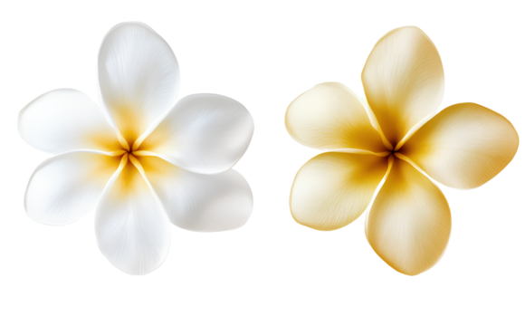 White and yellow frangipani flowers isolated on a transparent background, cutout PNG file with a white background for easy digital collage optimization