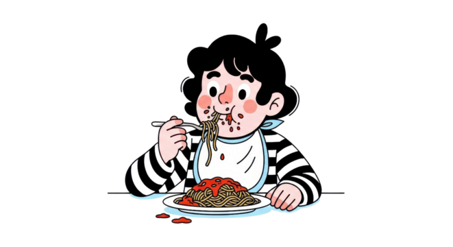 Whimsical cartoon of a boy enjoying a plate of spaghetti with gusto, a fun messy eater illustration