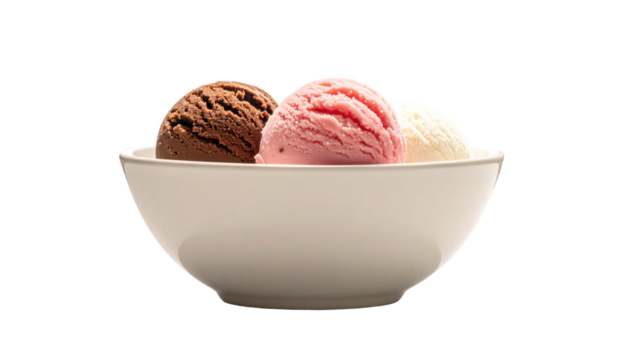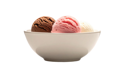 Delicious scoops of rich chocolate ice cream served in a clear glass bowl with a spoon, isolated on transparent background