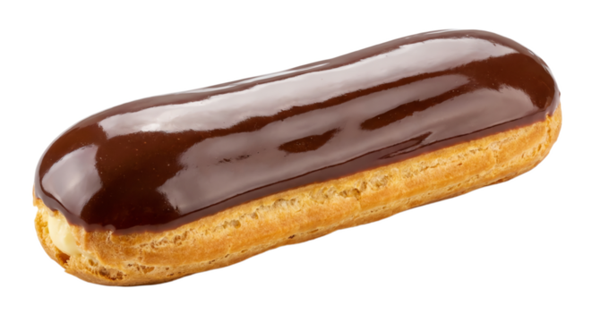 Delicious chocolate eclair with shiny glaze and cream filling isolated on transparent background, studio shot, classic French pastry.