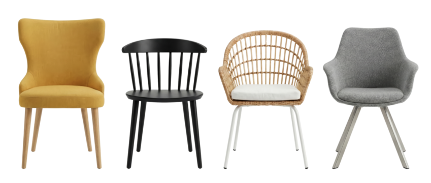 Four diverse chairs: yellow upholstered, black spindle, rattan armchair, grey fabric