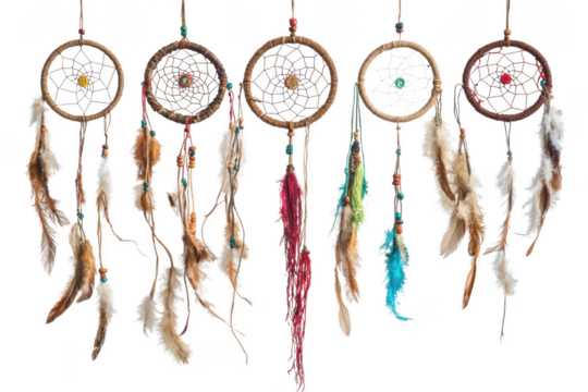 Vibrant dreamcatchers with colorful feathers and beads on transparent background
