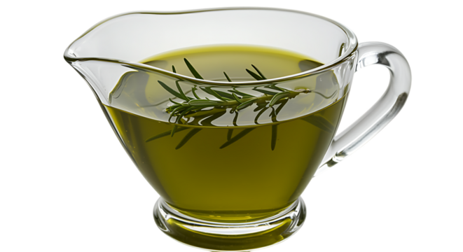 glass pitcher filled with green liquid herbs floating inside on transparent background