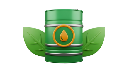 3d icon of green barrel with oil drop and leaves isolated on transparent background, symbolizing ecofriendly energy solutions