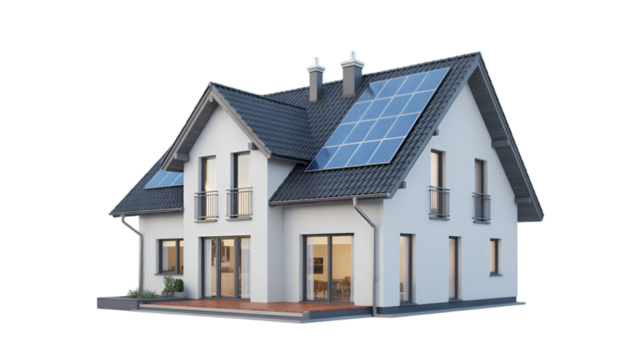 Modern white house with solar panels on roof, eco friendly home with black roof and balcony, large windows and doors isolated on transparent background
