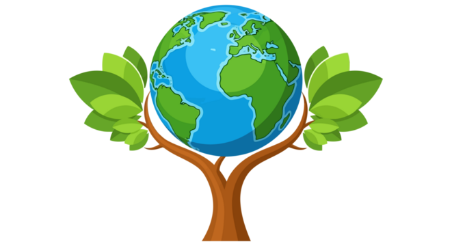 Earth globe symbol with green continents and blue oceans, topped with vibrant green leaves. Transparent background