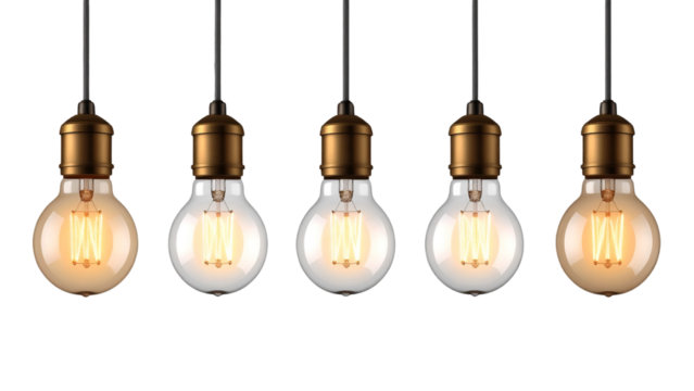 Collection of glowing light bulbs hanging isolated on a transparent background