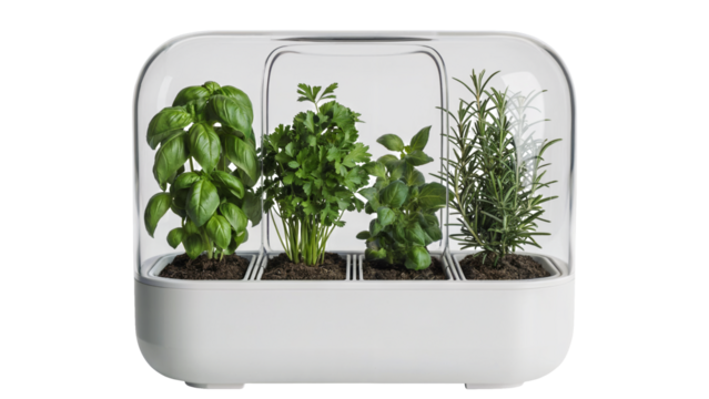Grow Fresh Herbs Indoors Year-Round with this Sleek Modern Hydroponic System for Cooking, Gardening, and Sustainable Living in a Stylish Home Kitchen isolated on white or transparent PNG.