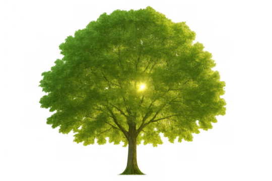 Green tree standing tall with sun shining through its vibrant leaves. Representing nature, environment, and ecological balance. Transparent background