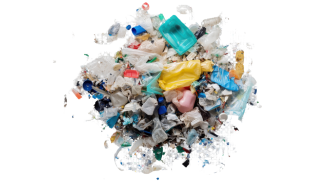 Colorful plastic bottle sculptures overflowing with recycled waste, a vibrant commentary on consumption and environmental responsibility against a stark white background.