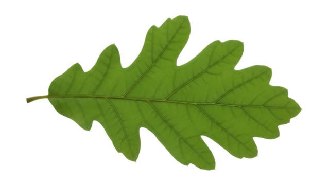 Green oak leaf isolated PNG on transparent background, detailed foliage of deciduous tree for design and educational use