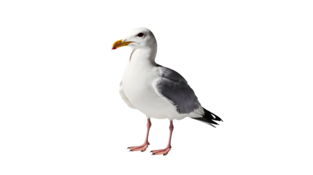 Majestic coastal seabird, a common gull with striking grey and white feathers, captured in a full-body profile view, isolated on a plain white background