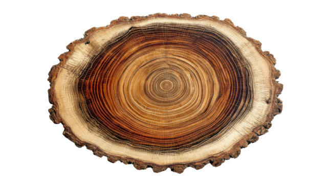Wood slice cross section showing growth rings and rough bark texture on transparent background