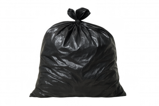 Black plastic garbage bag tied and full with trash, representing waste, pollution and environmental concerns, transparent background