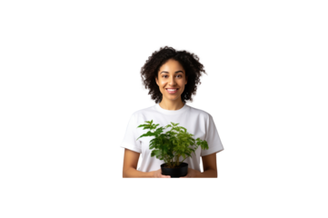Female volunteer stands holding a plant and smiles at the camera. transparent background