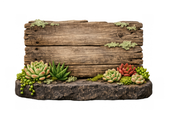 Rustic wooden sign with succulents on stone base, blank banner with copy space, natural garden design element
