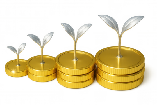 Silver seedlings sprouting through golden coin stacks, representing financial growth, investment success against transparent backdrop
