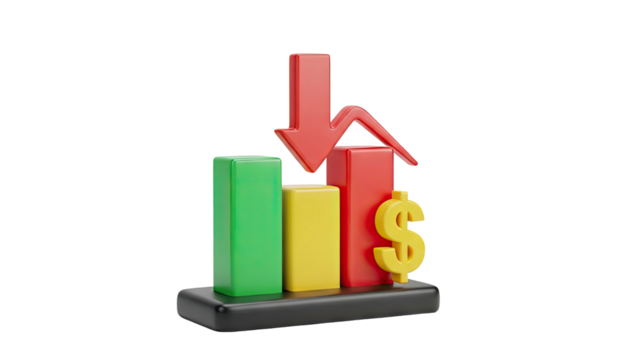 3D Bar chart with downward arrow and dollar sign on transparent background