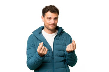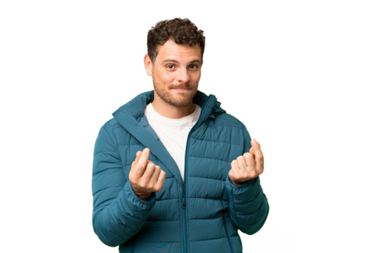 Brazilian man over isolated chroma key background making money gesture but is ruined