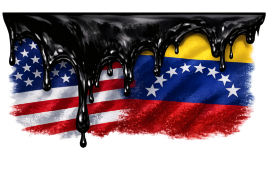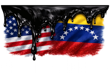 Black oil dripping over American and Venezuelan flags, symbolizing economic relations