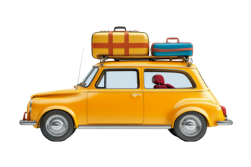Vintage yellow car with luggage on roof transparent background png travel concept white environment