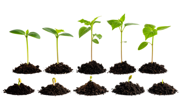 Seedlings in varying stages of growth emerging from rich, dark soil piles