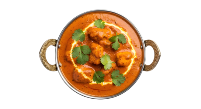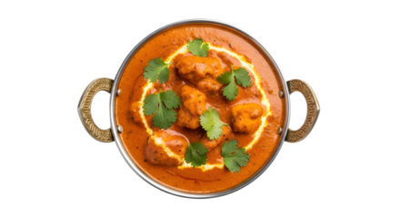 Aerial view of butter chicken served in a metal kadai with handles, garnished with fresh cilantro in a png format