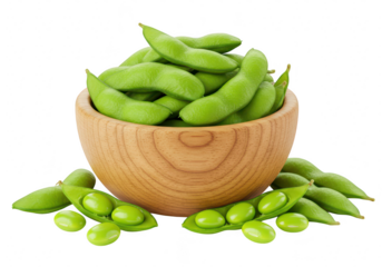 A wooden bowl filled with fresh green edamame pods isolated on transparent background
