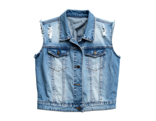 Distressed light wash denim sleeveless jacket with frayed edges