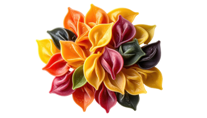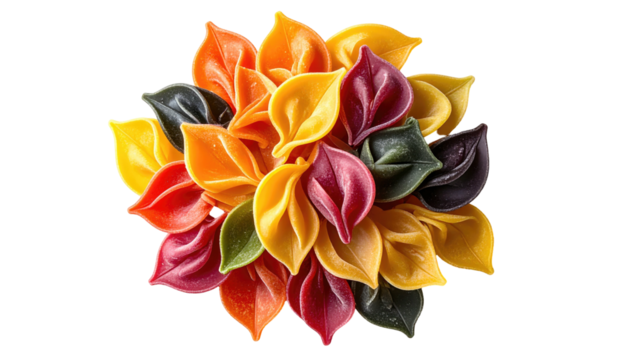 Colorful, leaf-shaped pasta arrangement against a stark, black background
