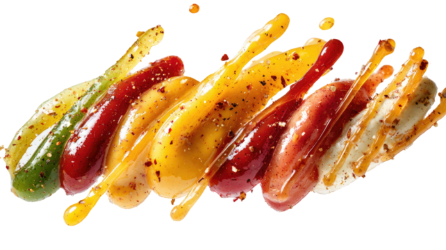 Array of vibrant sauces artfully arranged with speckled seasonings on black