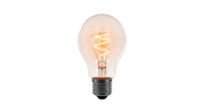 A clear glass light bulb glows with filament detail, isolated on black background