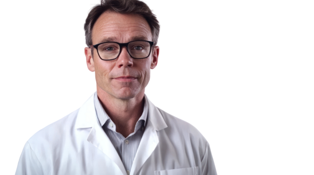 Professional male doctor in a lab coat, looking serious and confident against a white background, portraying expertise in the medical field.