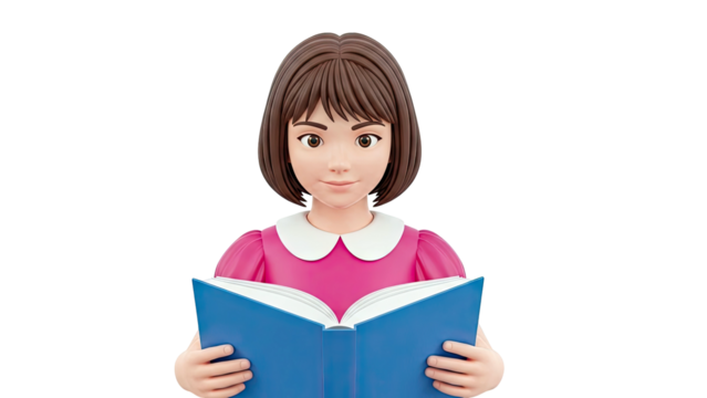 3D Cartoon Woman in Blue Suit Holding Book and Pen