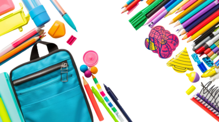 Teal backpack filled with colored pencils and a notebook isolated on white background, ideal for school or art supplies storage