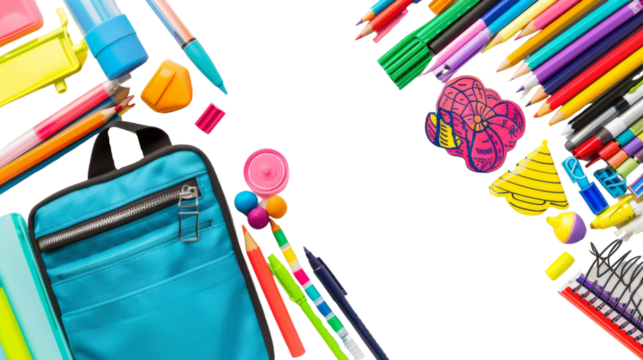 Colorful school items arranged with an apple and alarm clock, isolated on white, PNG