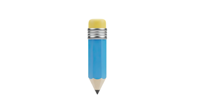 3D Blue pencil with yellow eraser and silver ferrule on transparent background