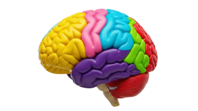 Colorful human brain model PNG isolated on transparent background, anatomical educational tool for medical study and science projects