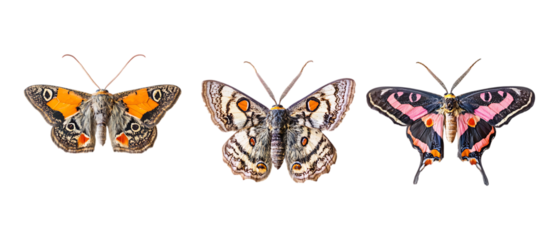 Moth species collection with colorful wing patterns is isolated on a transparent background for educational biology posters.