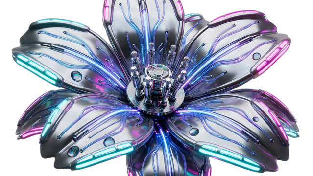 Futuristic Metallic Cyberpunk Flower with Glowing Neon Veins Isolated on Transparent Background