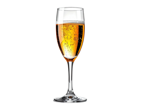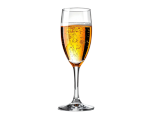 A champagne flute filled with a light amber-colored bubbly drink, showcasing effervescence and a slender stem