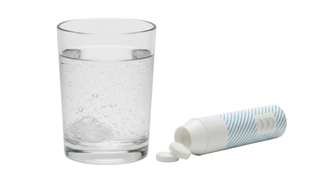 Isolated Effervescent Tablets Dropping into Glass of Water
