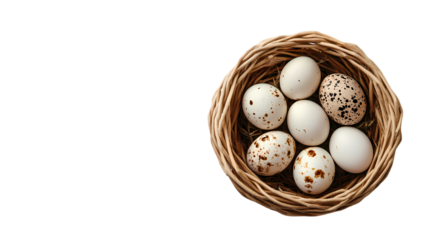 A top view of a woven basket filled with several speckled and white eggs  isolated on transparent background