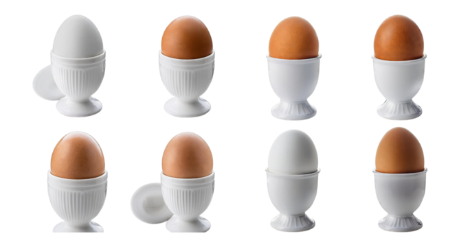 Fresh Brown Eggs in Classic White Egg Cups on a Clean Background, isolated on transparent background