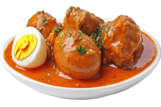 bowl of deliciously cooked egg curry. showcasing six boiled eggs immersed in a rich. spicy gravy. garnished with fresh herbs it highlights a popular dish in many cuisines. emphasizing the blend of fla