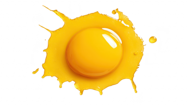 A raw egg yolk resting on a white background. surrounded by a splash of egg white. symbolizing freshness and culinary potential. perfect for food photography and cooking articles