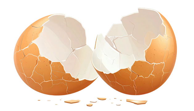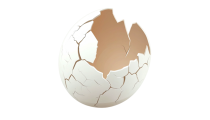 Cartoon illustration of a cracked eggshell against a solid black background. Interior reveals light brown color