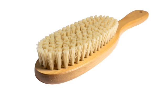 Wooden handled brush with tightly packed bristles, isolated on black background, angled view