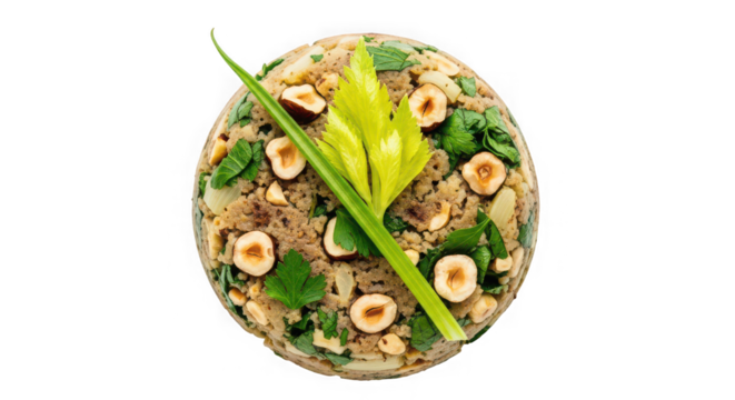 Decorative egg shaped food arrangement with nuts and green vegetables