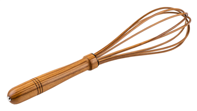 Wooden handled whisk for baking and cooking for culinary applications on transparent background